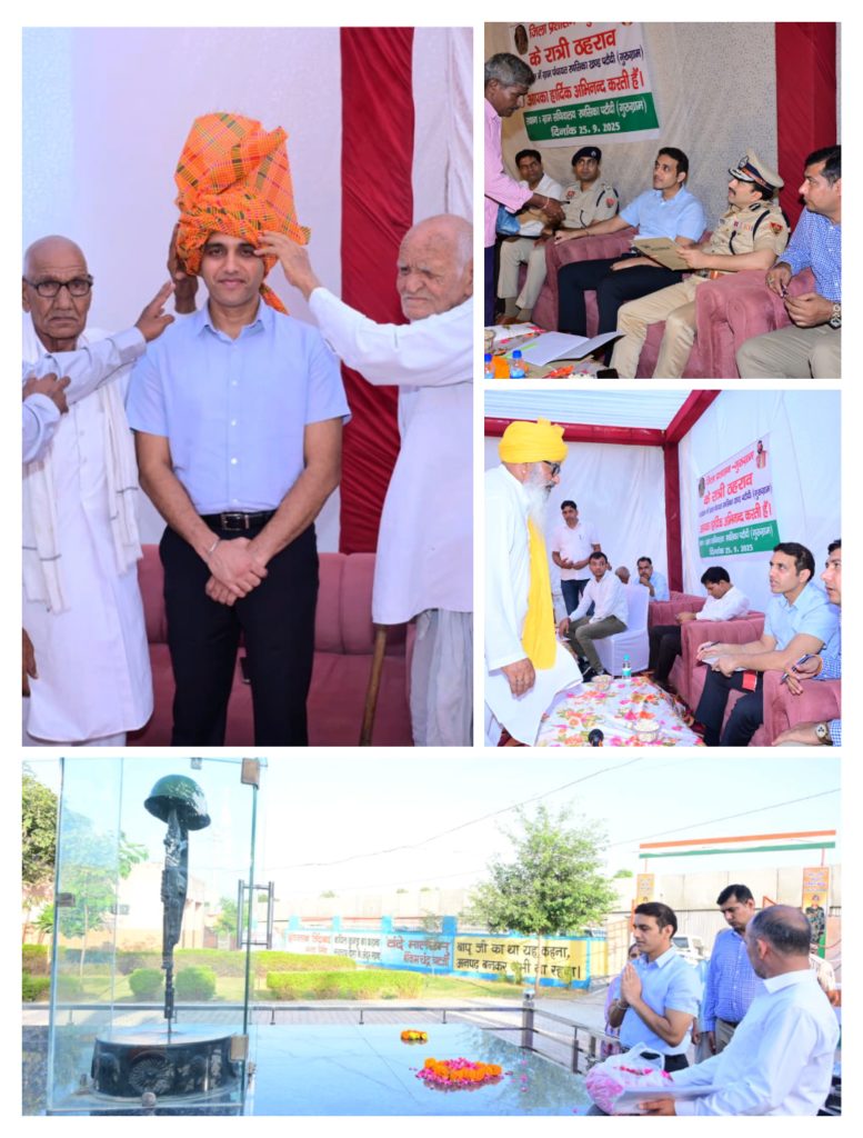 गुरुग्राम, सतीश भारद्वाज : जिला प्रशासन द्वारा वीरवार को पटौदी ब्लॉक के गांव रणसिका में रात्रि ठहराव कार्यक्रम का आयोजन किया गया। इस अवसर पर डीसी अजय कुमार तथा सीपी विकास अरोड़ा स्वयं गांव पहुंचे और ग्रामीणों से सीधा संवाद कर उनकी समस्याओं को सुना। डीसी ने प्रशासनिक अधिकारियों के साथ मिलकर कई शिकायतों का मौके पर ही समाधान किया। गांव पहुंचने पर सरपंच व ग्रामीणों ने पगड़ी पहनाकर उनका स्वागत और सम्मान किया। डीसी अजय कुमार ने इससे पूर्व शहीद कैप्टन कपिल कुंडू की प्रतिमा पर पुष्प अर्पित कर उन्हें अपने श्रद्धासुमन अर्पित किए।