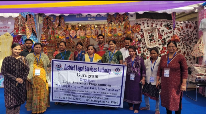 गुरुग्राम, सतीश भारद्वाज : जिला विधिक सेवाएँ प्राधिकरण, गुरुग्राम द्वारा सरस मेले में जागरूकता शिविर का आयोजन किया गया। शिविर का उद्देश्य आमजन को उनके विधिक अधिकारों, निःशुल्क विधिक सहायता सेवाओं तथा राष्ट्रीय विधिक सेवाएँ प्राधिकरण और हरियाणा राज्य विधिक सेवाएँ प्राधिकरण की विभिन्न जनकल्याणकारी योजनाओं के प्रति जागरूक करना रहा।