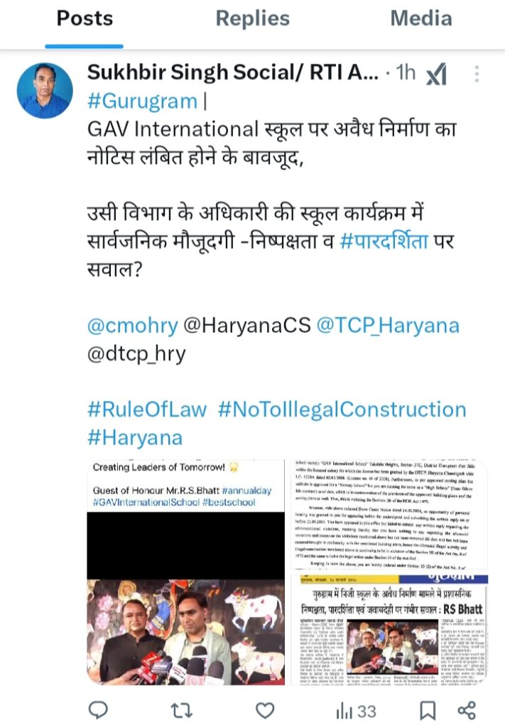 गुरुग्राम,सतीश भारद्वाज : गुरुग्राम जीएमडी में बतौर डीटीपी तैनात एवं जिला नोडल अधिकारी आरएस भाट पर गुरुग्राम निवासी एक आरटीआई एक्टिविस्ट समाजसेवी ने जीएवी ग्रुप आफ स्कूल के संचालकों के मिलीभगत कर स्कूलों द्वारा किए गए अवैध निर्माण तथा कब्जे को ना हटाने के गंभीर आरोप लगाते हुए अपने एक्स अकाउंट के माध्यम से सरकार से कार्यवाही करने का अनुरोध किया है।