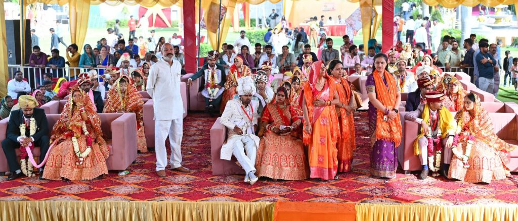 कथा वाचक मोहित व्यास भी समारोह में पहुंचे। सभी अतिथियों का मंच पर सम्मान किया गया। पिछले करीब तीन महीने से स्वास्तिक फाउंडेशन के पदाधिकारी, सदस्य इस सामूहिक विवाह समारोह की तैयारियों में जुटे थे। हर बार पहले से भव्य शादी करने की सोच के साथ इस बार और भव्यता समारोह में नजर आई। जब एक साथ 16 दूल्हों की बारात ओल्ड दिल्ली रोड से निकली तो हर कोई देखता रह गया। भव्यता से सजाए गए रथ पर बजते डीजे और ढोल पर बाराती नाचते-गाते चले। बारात में विंटेज कारों को भी शामिल किया गया, ताकि गरीब परिवारों के वर-वधू यह महसूस ना करें कि उनकी शादी में कुछ कमी रह गई। दूल्हों के परिवारजन, रिश्तेदार मस्ती में झूमते-गाते हुए बारात में चले। संस्था के संरक्षक बनवारी लाल सैनी एवं सुमेर सिंह तंवर ने बताया कि स्वास्तिक फाउंडेशन का सालाना सामूहिक विवाह समारोह का उद्देश्य यही है कि हर बेटी के हाथ पीले होने चाहिए। चाहे वह गरीब हो मध्यमवर्गीय परिवार से हो। हर किसी का वैवाहिक जीवन का सपना पूरा होना चाहिए।